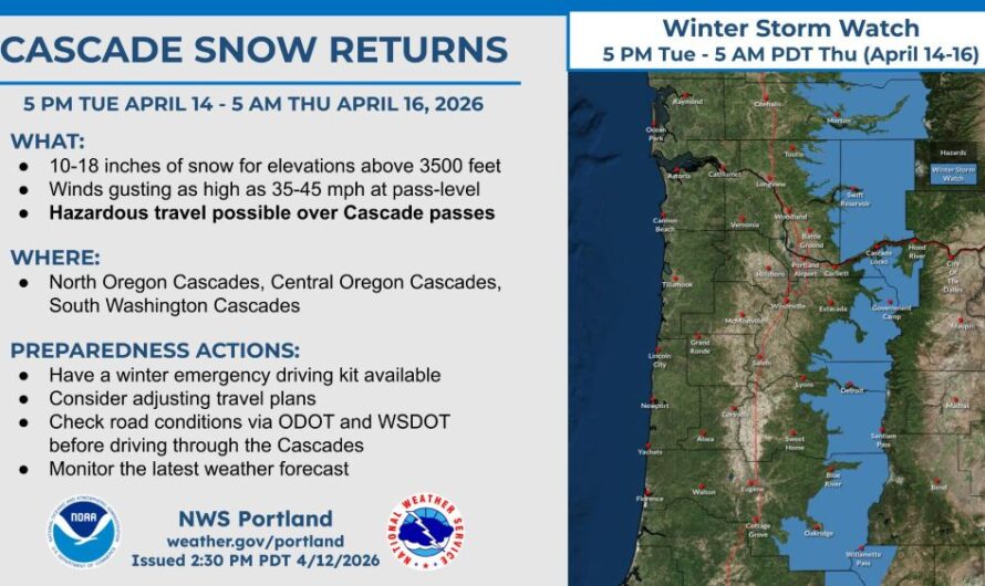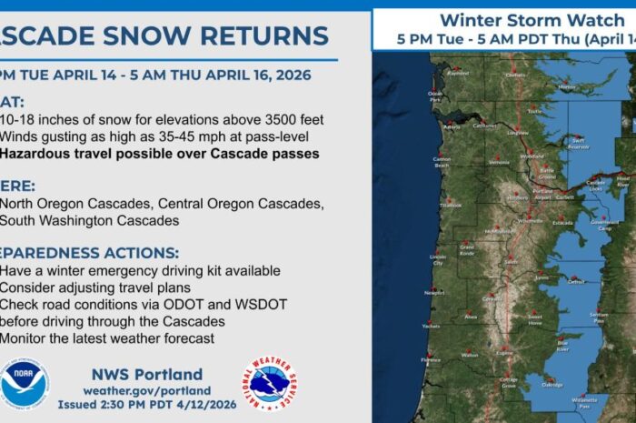 4月12日,美国气象局发布紧急天气警报,宣布从周二(4月14日)下午起至周三(4月15日)深夜,俄勒冈州与华盛顿州喀斯喀特山脉将迎来一场强烈冬季风暴,大范围降雪与强风将严重影响…
