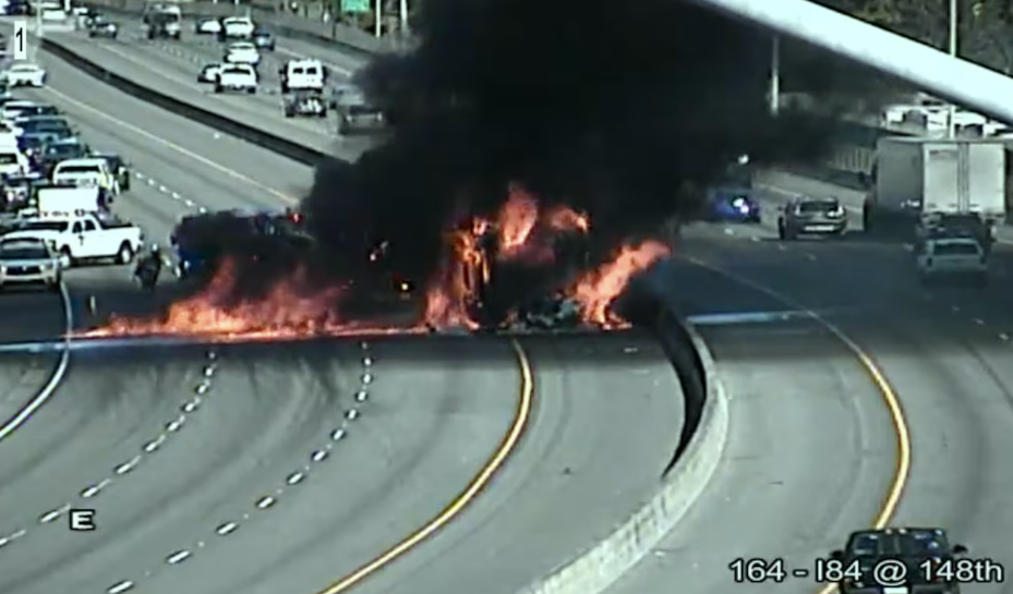 从交通监控画面可以看到,车辆在路肩上猛烈燃烧。下午5点时,I-84高速仅有东向一个车道开放,西向交通仍处于全面封闭状态。