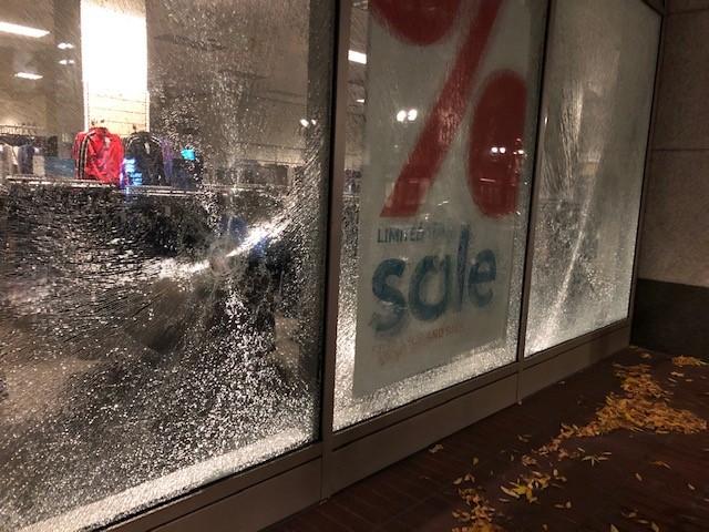 大约10点时,示威者对沿街的企业一间逐一间的爆玻璃,很多窗户被打砸,银行自动取款机也被砸。