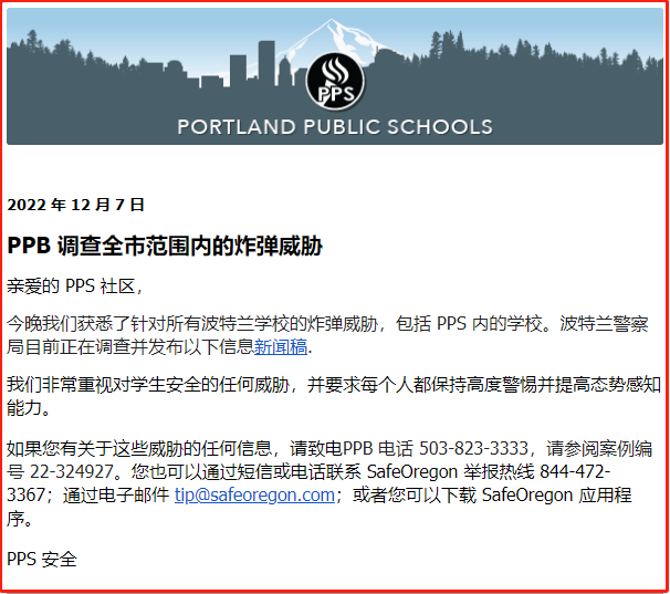 俄勒冈州最大学区波特兰公立学区PPS向家长发出邮件,表示“非常重视学生安全的任何威胁,并要求每个人都保持高度警惕并提高态势感知能力。”