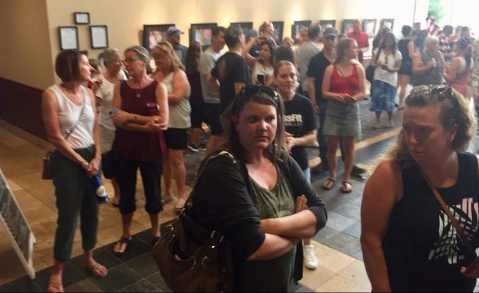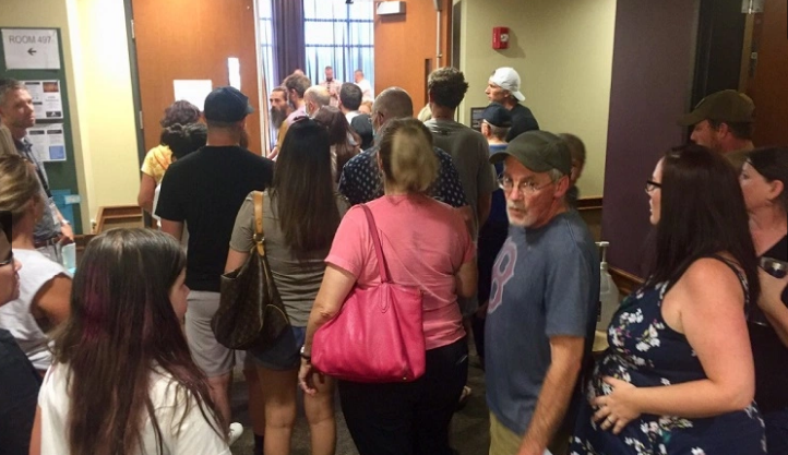 一大群人聚集在大楼外,很多人由于容量限制无法进入,人们在炎热中大汗淋漓,气氛非常紧张。