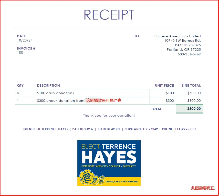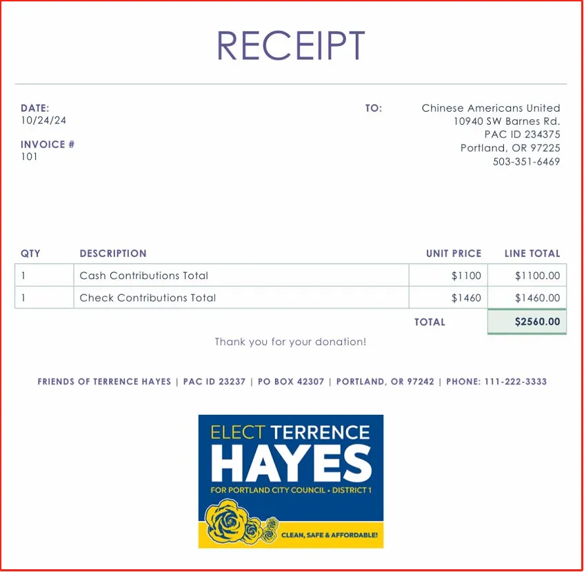 - 向波特兰市议会第1选区议员候选人特伦斯·海斯(Terrence Hayes)捐款500美元。