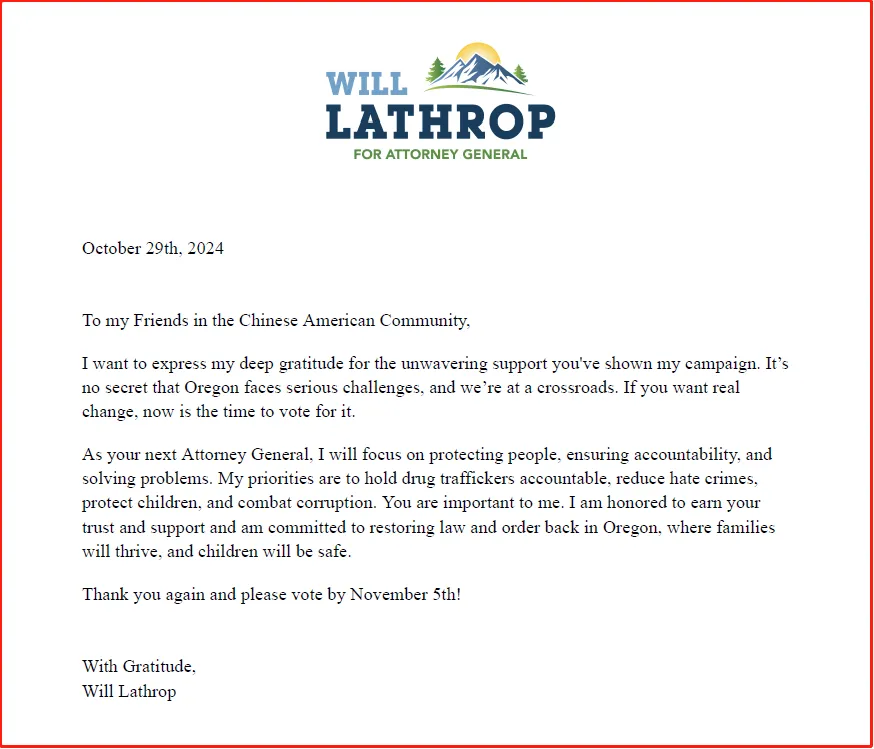 向俄勒冈州总检察长候选人威尔·莱斯罗普(Will Lathrop)捐款1500美元;