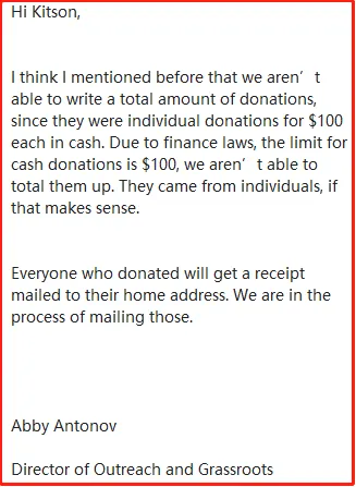 为了帮助特伦斯·海斯(第1选区竞争激烈,特伦斯·海斯被多个执法部门认为是重要候选人)获得政府最大的竞选补助,华人社区中有68人分别写了小额支票(每张约20美元),总额达1460美元。