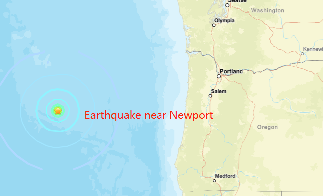 10月29日清晨6时左右,俄勒冈州纽波特(Newport)以西近海发生5.4级地震,美国地质调查局(USGS)报告称震源深度约为6.2英里(约10公里)。