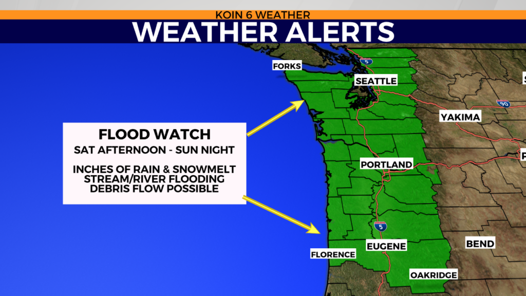 气象部门对俄勒冈州西部和华盛顿西南部的大部分地区发布了洪水监视。从周六下午4点至周日晚上生效。一些地区可能会出现山体滑坡。