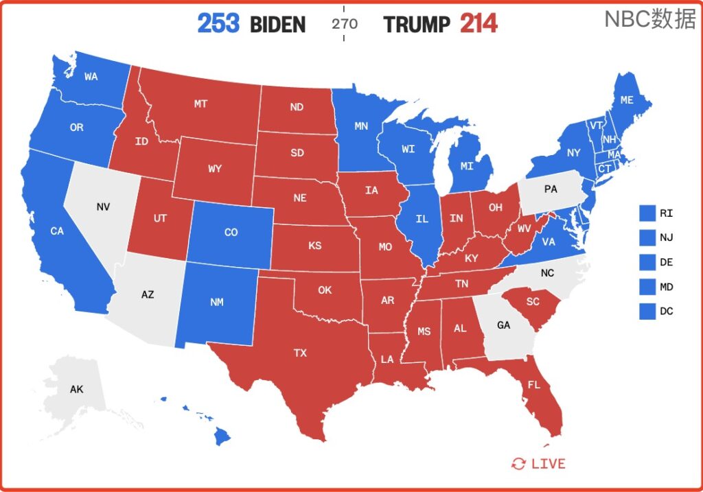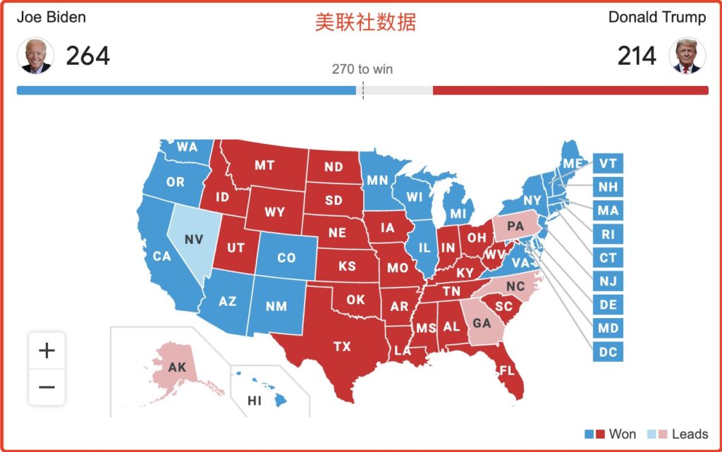 目前几乎所有媒体都是引用美联社的数据,所以大家看到的点票结果是这样的: