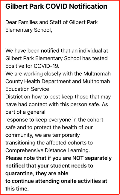 9月11日,美国波特兰东南区的一些家长纷纷收到邮件通知,位于Holgate 136大道(或Foster 136大道)附近的Gilbert Park 小学查出一名学生感染了新冠病毒。