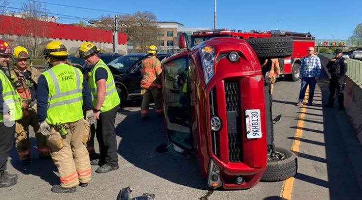 波特兰消防救援官员说,两辆汽车中的一辆侧翻了。急救人员无需撬开汽车就能将所有人从汽车中救出。
