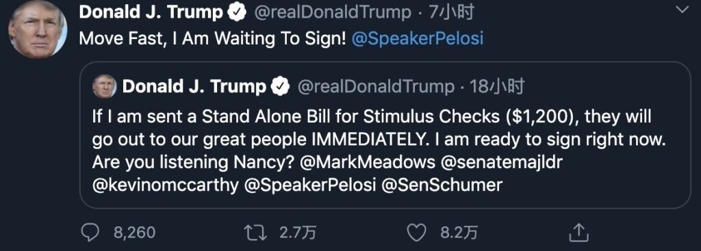 媒体报道说,在下令停止谈判后仅几个小时,特朗普敦促国会单独通过一些紧急的援助法案(例如每人发1200美元)。而众议院议长一直拒绝这种“零星”的法案。