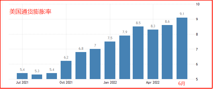 尽管美联储在过去几个月连续加息,但美国通货膨胀仍在飙升!美国劳工部7月13日星期三报告,6月份的通胀率同比升至9.1%!!!!!!超出预期,再刷新高!