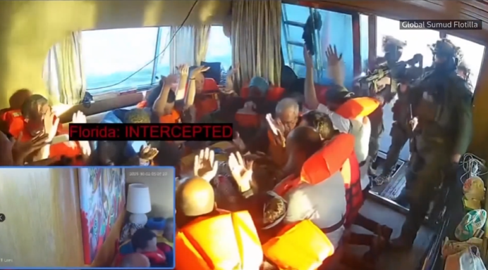 根据社交媒体上的直播画面,夜间以色列士兵全副武装登船,船上乘客身穿救生衣、双手举起。