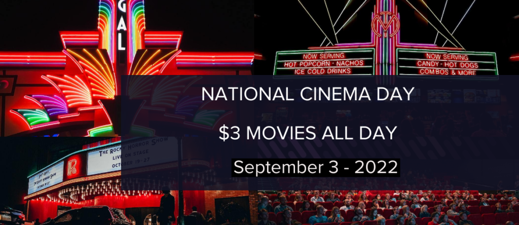 9月3日星期六,庆祝新推出的全美电影日,全美国绝大多数电影院在这一天提供3美元的电影票!