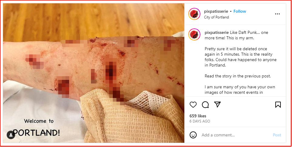 谢丽尔·韦克豪瑟 (Cheryl Wakerhauser)随即将展示伤口的照片换成了波特兰市长惠勒先生,并痛斥这座城市没有保护人们的安全。