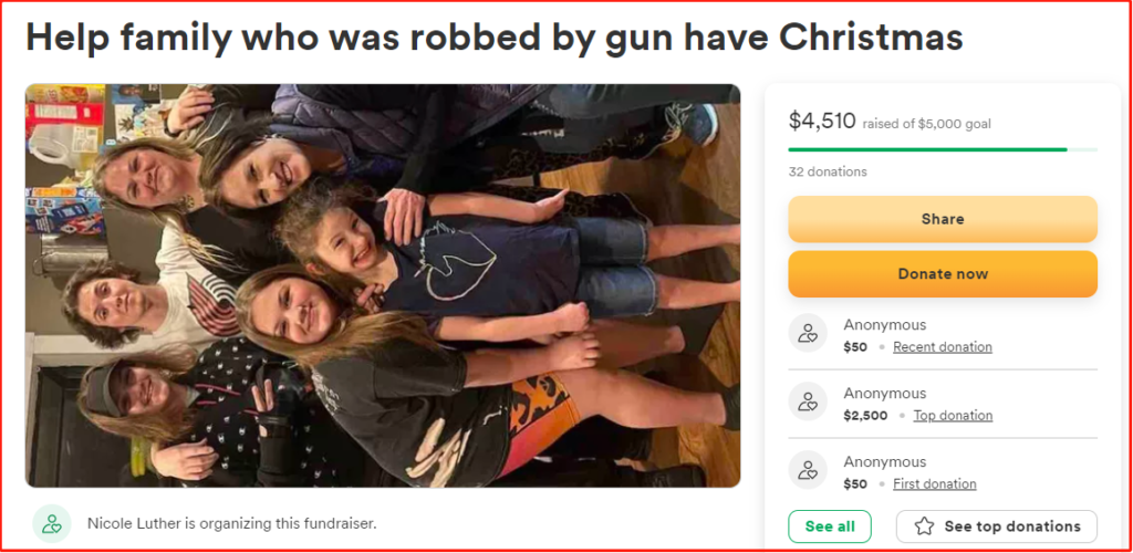 不过,这个家庭也很幸运。虽然遭遇抢劫,但孩子的爸爸(可能是离异家庭)给他们买了圣诞树,学校给他们买了礼物。而且他们家还在网上发起众筹,截至12月18日,一共收到了4510美元的捐款。