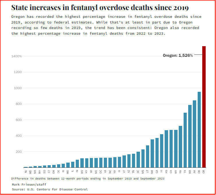 2月19日,各大媒体报道,美国疾病控制中心(CDC)发布最新报告,自2019年以来,俄勒冈州芬太尼过量死亡增加1530%,是全美国增幅最高!
