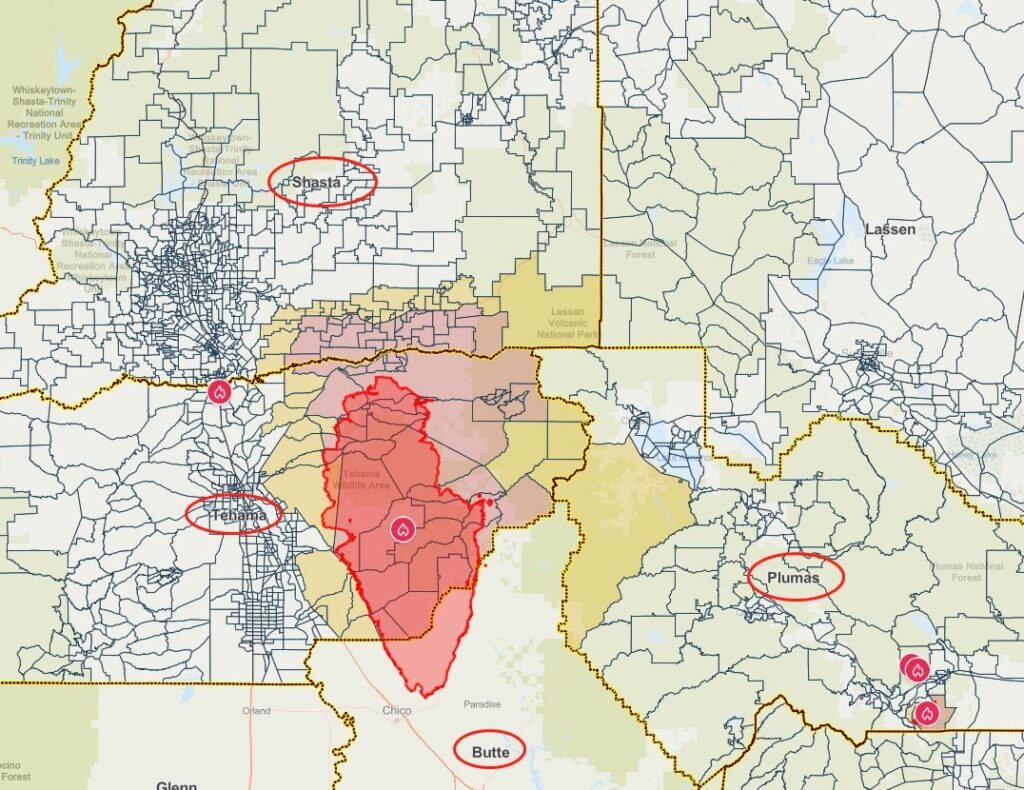 当地政府部门已经下令撤离,疏散令影响到四个县——比尤特县(Butte)、蒂哈马县(Tehama)、沙斯塔县(Shasta)和普卢默斯县(Plumas)。