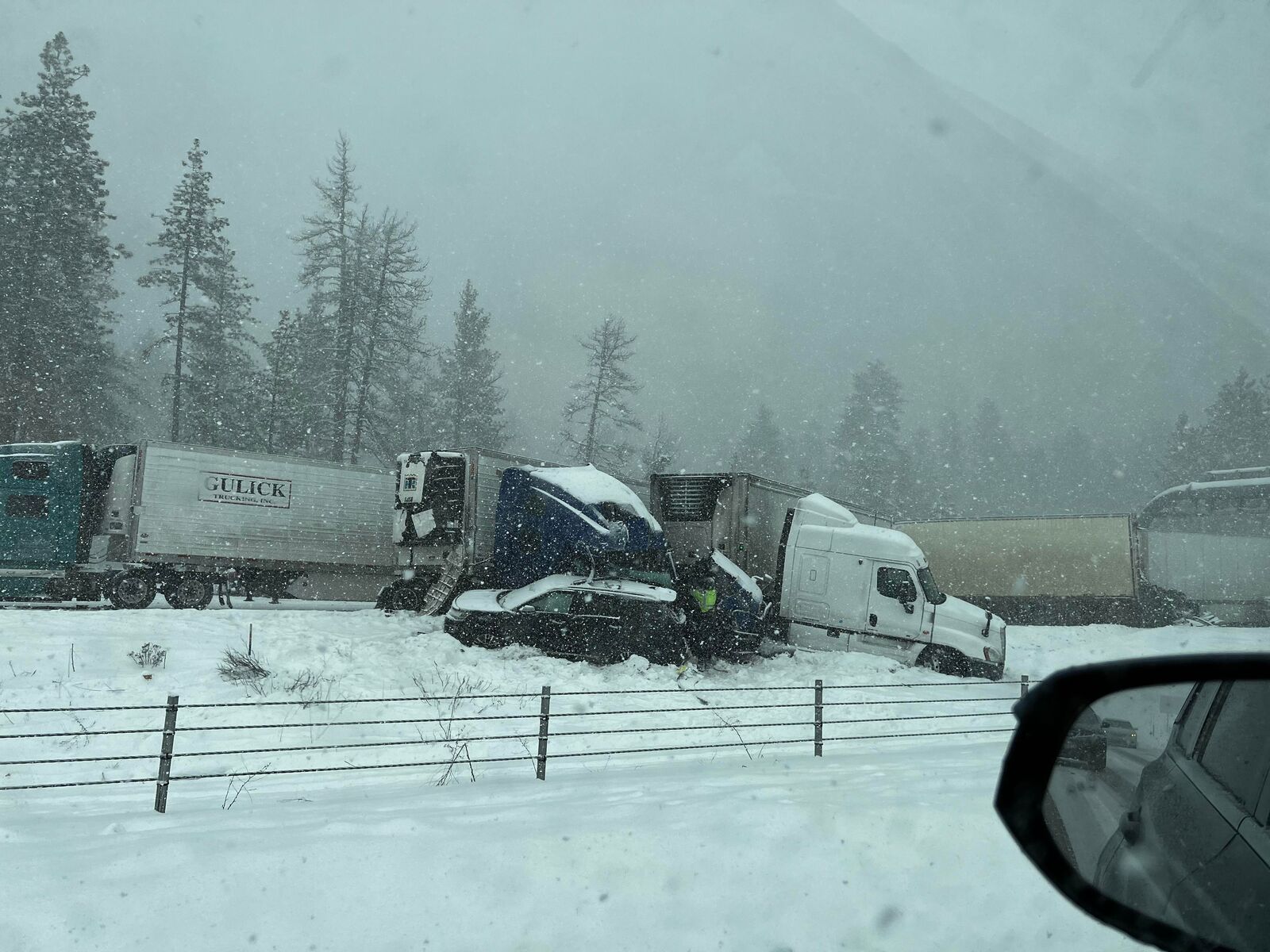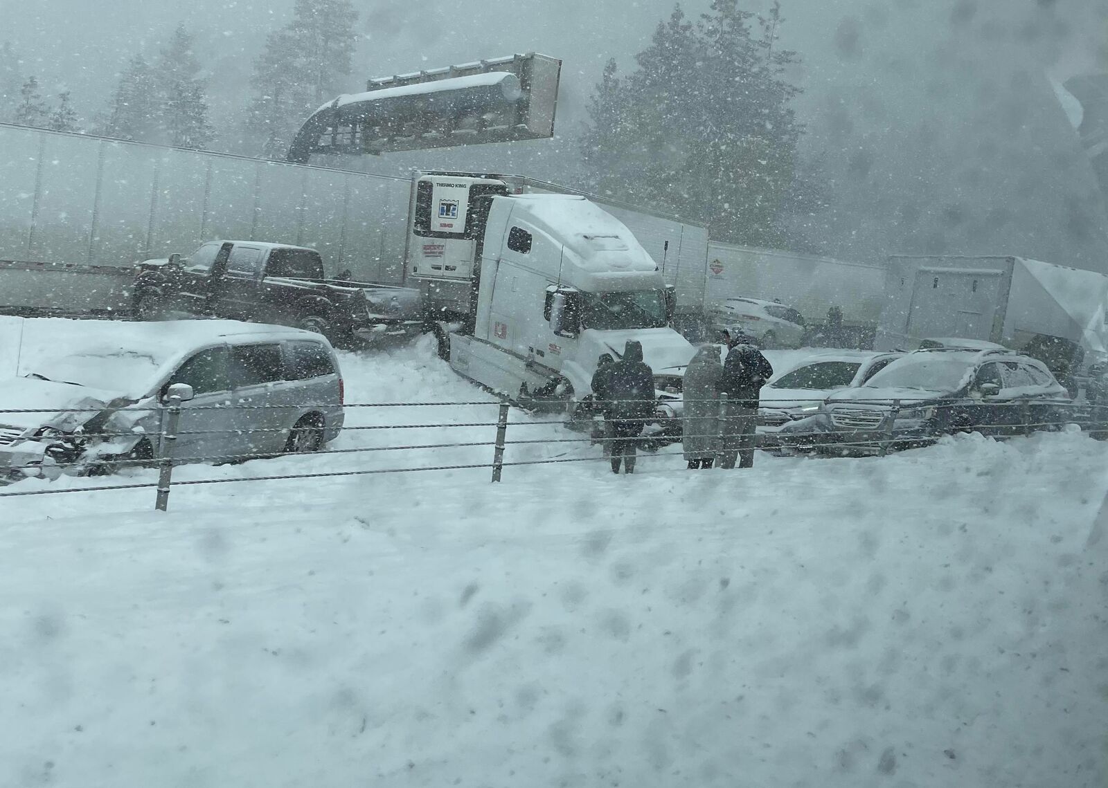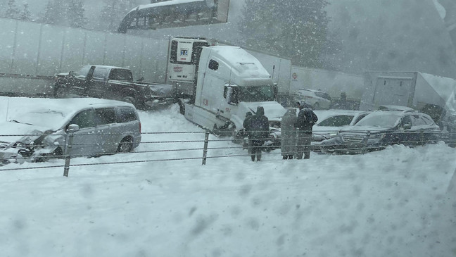 目击者说,看到数十辆卡车和其他车辆发生相撞,一些汽车在雪地中翻车并冲出道路。
