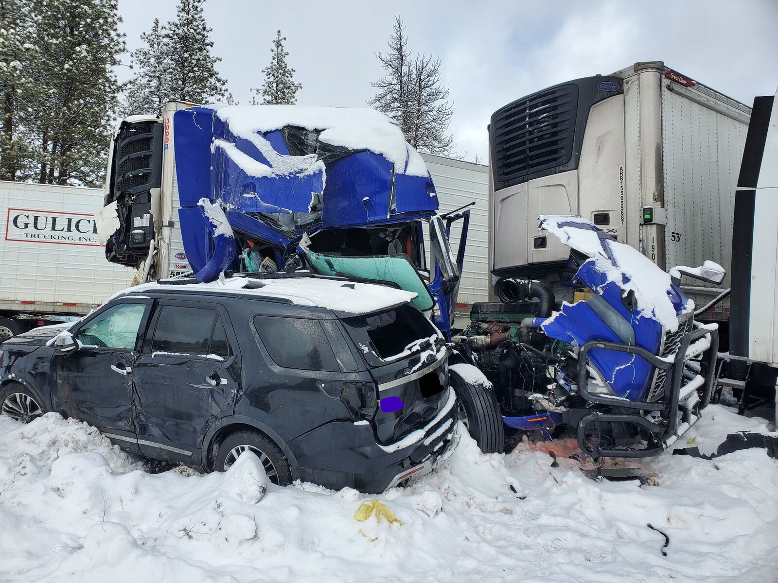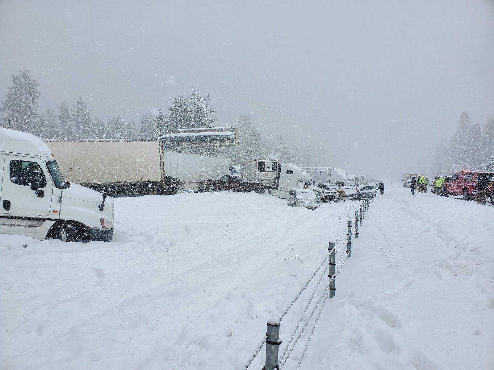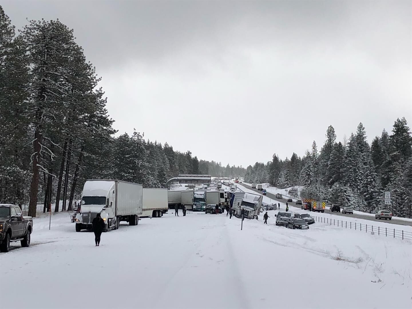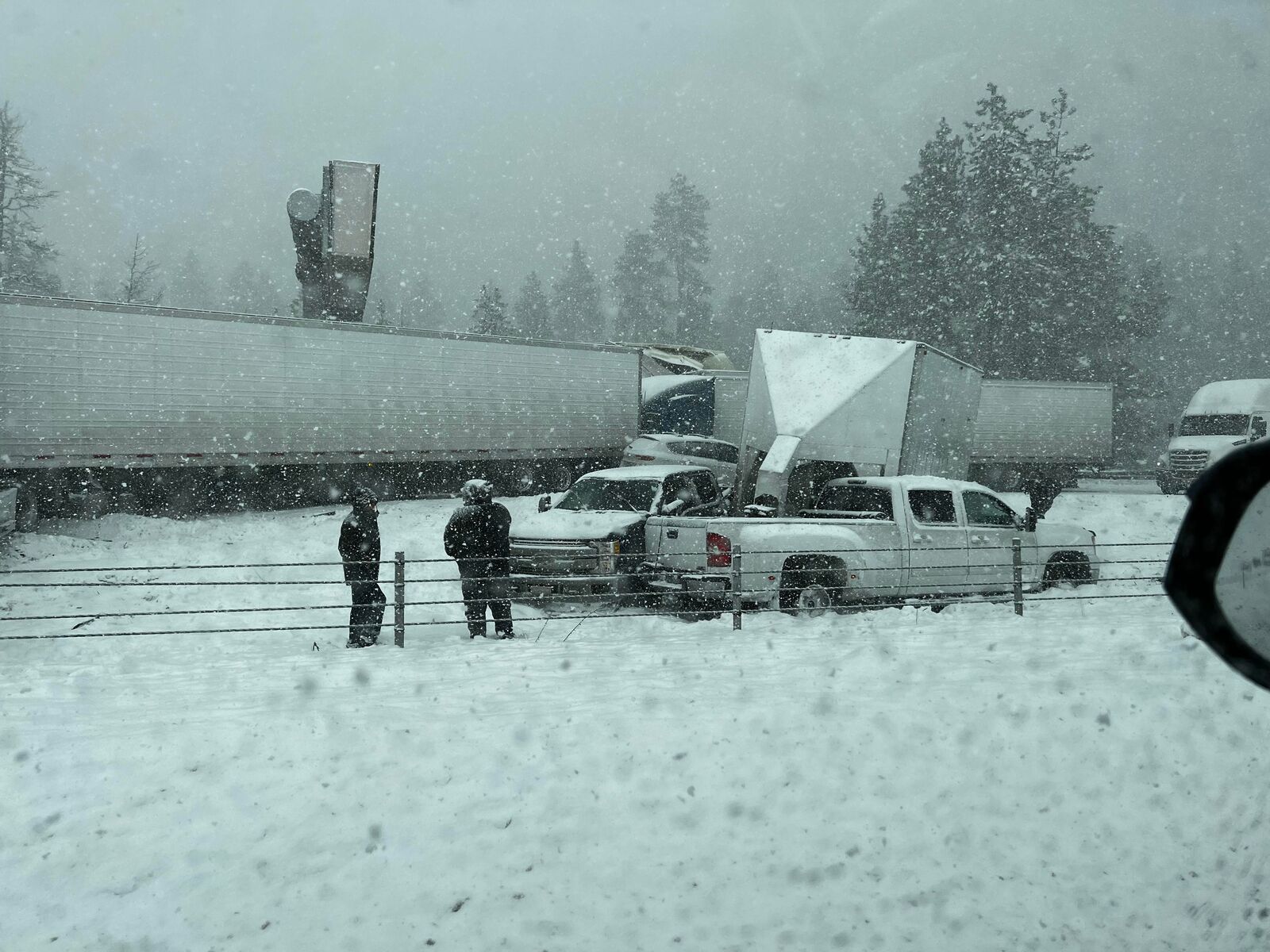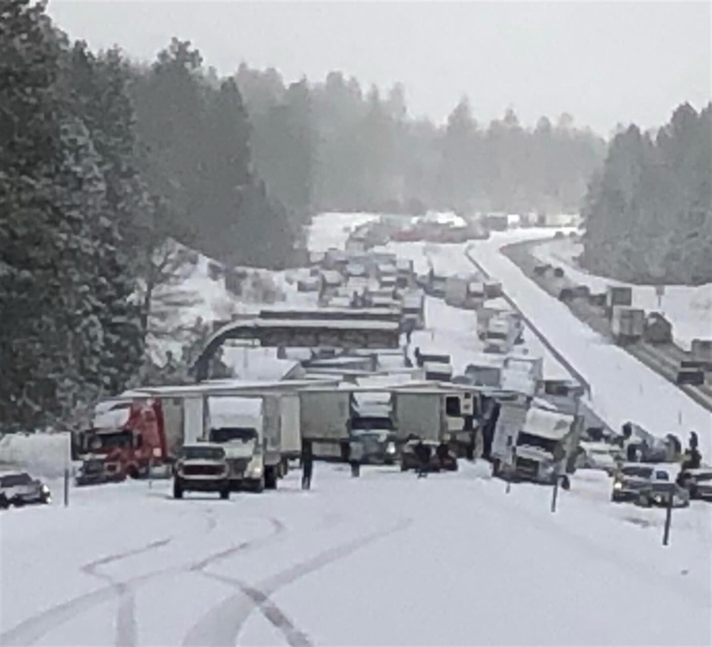 2月21日星期一,美国俄勒冈州东部Pendleton市和La Grande市之间的84号公路被雪覆盖,发生严重交通事故,约100辆车相撞。