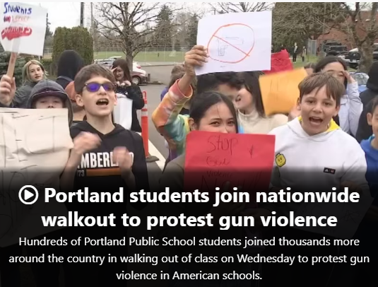 4月5日星期三,俄勒冈州波特兰富兰克林高中(Franklin)、林肯高中(Lincoln)、私立西北学院高中(Northwest Academy)、西西尔万中学(West Sylvan Middle School)等PPS学区的数百名学生罢课,参加全美国的抗议枪支暴力示威。