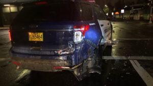 波特兰警察局说,星期六晚上,一辆警车在波特兰北部一个十字路口等红灯是被追尾,警车损坏,一名警察受伤。