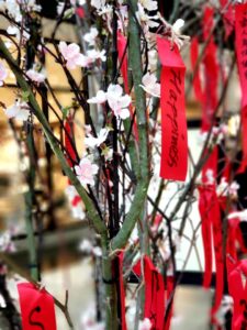 人们将带有愿望象征的红丝带系在许愿树上,祈许愿望成真!