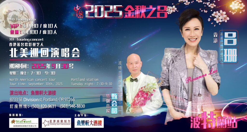 波特兰即将迎来华语乐坛的殿堂级盛事——香港著名歌影视艺人、“平喉天后”吕珊,将于 9月30日(周二)晚7:30 亮相 波特兰鱼乐轩大酒楼,用她独特的嗓音与真挚的情感,为观众奉上一场直抵心灵的金曲盛宴!