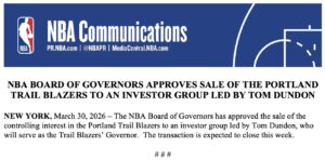 3月30日,Portland Trail Blazers(波特兰开拓者队)出售交易获得NBA Board of Governors(NBA董事会)一致通过,球队即将正式进入“新老板时代”。