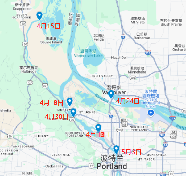 • 4月24日:哥伦比亚河,Hayden Island 附近