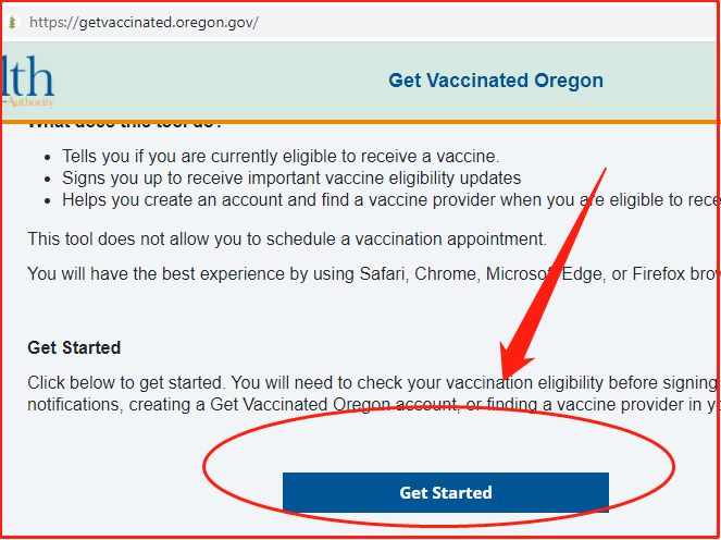 第三,找到“Get Started”,点击它。(如果你第二步找不到,请直接输入网址 getvaccinated.oregon.gov 进第三步)