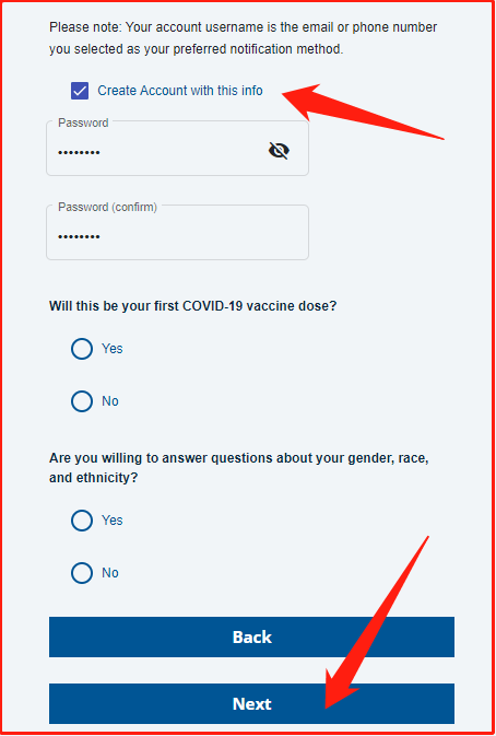 第七步,进入填写你的姓名,手机,邮箱,在哪个县,喜欢怎么收到通知。如下图,勾个勾吧,建立一个帐户方便以后改资料。问你愿意回答有关种族性别之类的,你回答Yes吧。少数族裔会优先通知打。还会问你要不要翻译,很人性的。回答后,点Next