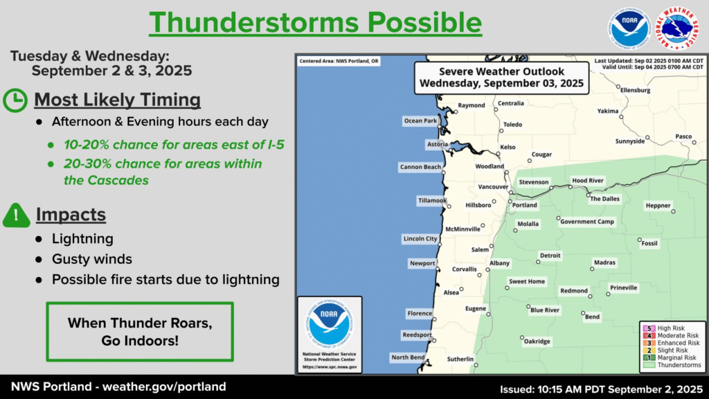 • 首席气象学家Josh Cozart表示:“喀斯喀特山区和威拉米特谷以南地区星期二下午和晚上可能再度出现雷暴。这些雷暴携带的水分有限,将使高海拔地区的野火威胁在傍晚持续偏高。”
