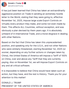 特朗普10月10日星期五宣布,美国将从 11月1日 起,对来自中国的所有进口商品 额外加征100%关税,并同时对“中国关键软件”实施出口管制!