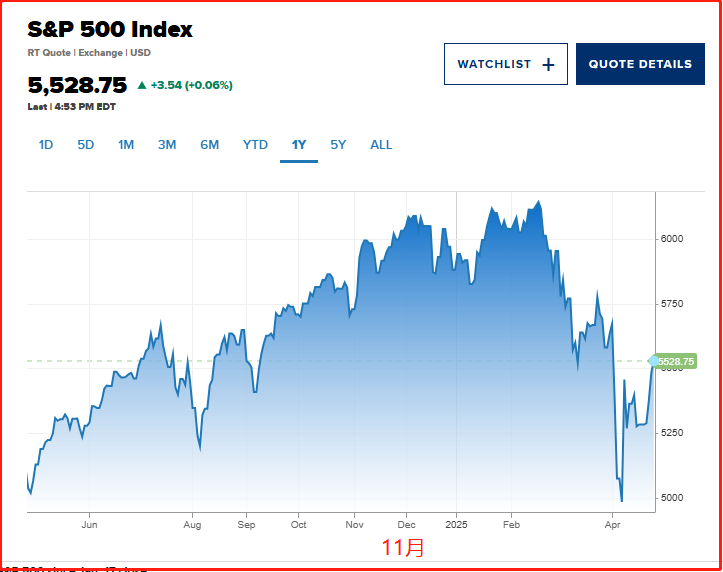 截至4月25日收盘,标普500指数报5528.6点,较2月19日创下的历史高点6144.15点大幅下跌,抹去了特朗普选举胜利以来的所有涨幅。