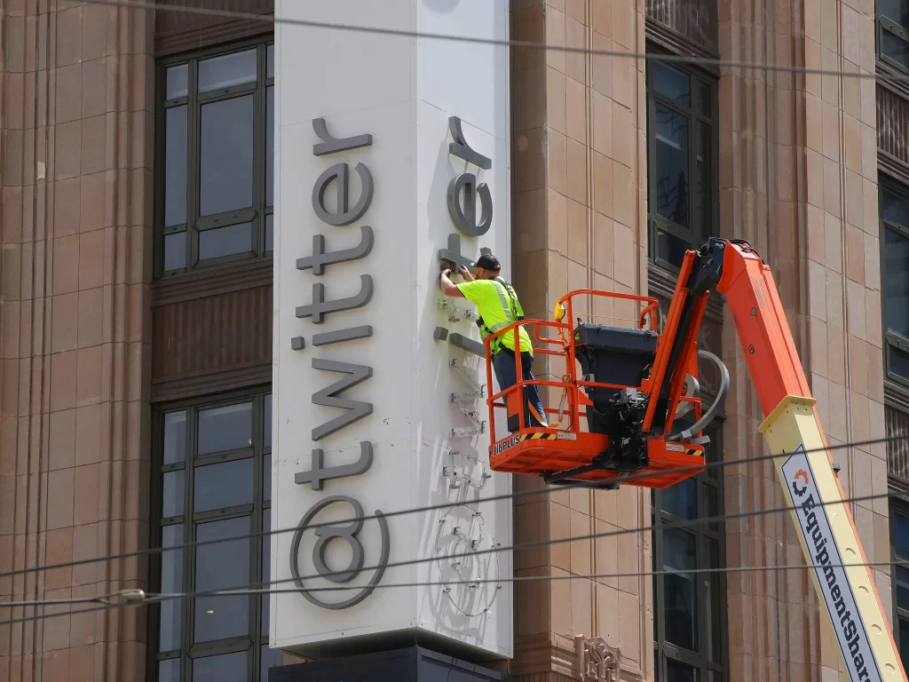 星期一当天,推特总部封锁了两条街,一台大型起重机正在拆除公司上的标志,“twitter”和那只“鸟”。