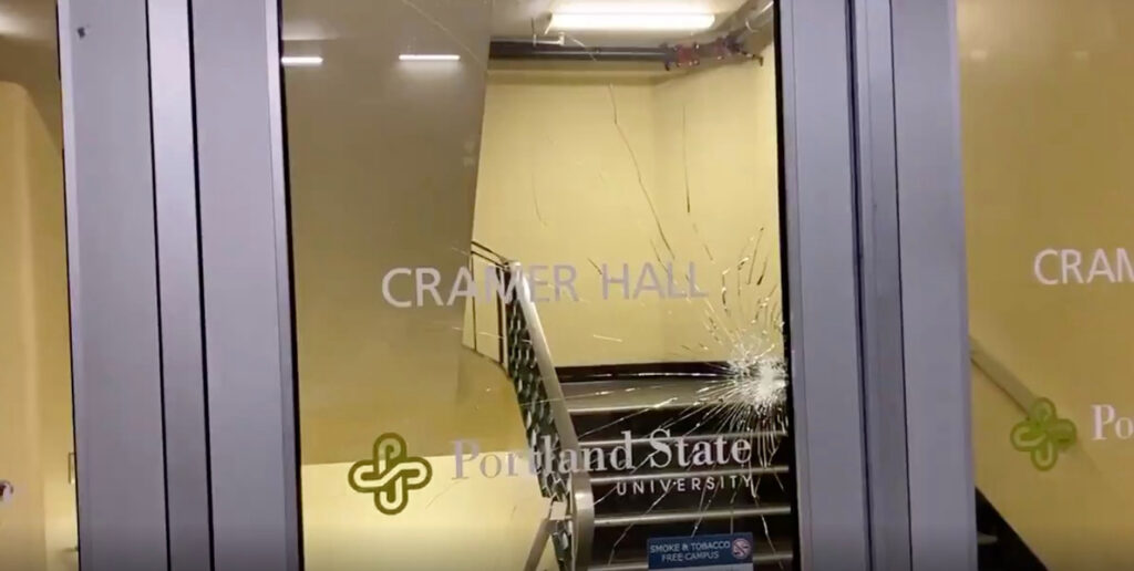 大约晚上9点,数十名抗议聚集起来,然后到达波特兰州立大学警察大楼,同时高呼杰森·华盛顿(Jason Washington)的名字,该名男子在2018年被校园警察枪击死亡(当年枪击发生时,Jason Washington持有枪支,没有听从警察命令并离开)。人群破门而入。