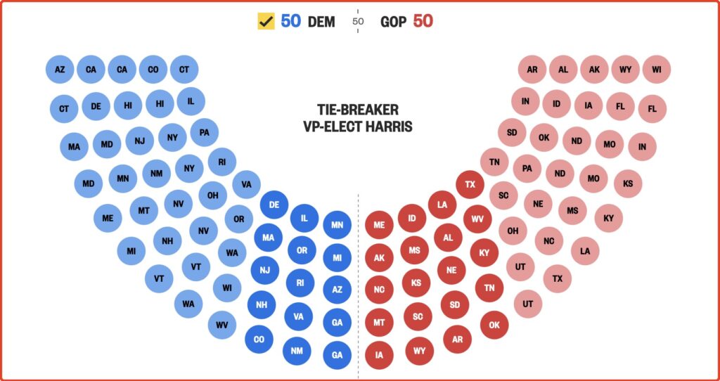 目前,在参议院中,共和党和民主党各占50席位。拜登上台后,其副总统也拥有投票权。即民主党拥有的投票权多于共和党。