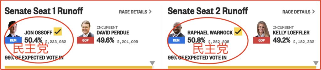 1月6日星期三,美国偌治亚州国会参议院议员重选结果出炉,两名民主党候选人同时胜出!