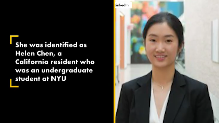 警方确认该女子来自加州洛杉矶北部的城市伯班克 (Burbank),名叫Helen Chen,22岁,是纽约大学的学生,在一家投资银行实习。